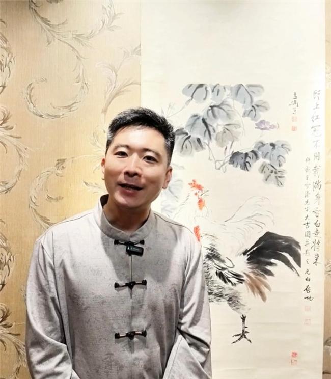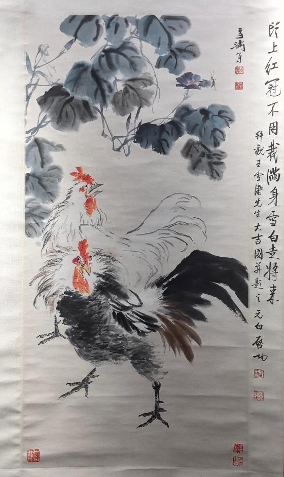 汪骏成指出,这幅约4.5平尺的《大吉图》是王雪涛艺术造诣的集中体现。先看题款 “雪涛写” 三字,笔力硬朗十足,运笔流畅自然,结体严谨规整,一眼便能看出王雪涛扎实的书法功底。构图极为考究,画中两只公鸡以小写意手法绘就,一只昂首挺立,一只俯身寻食,姿态威猛矫健,动态神韵与造型把控精准,将公鸡的精气神全然展现。